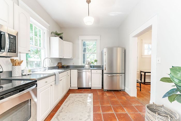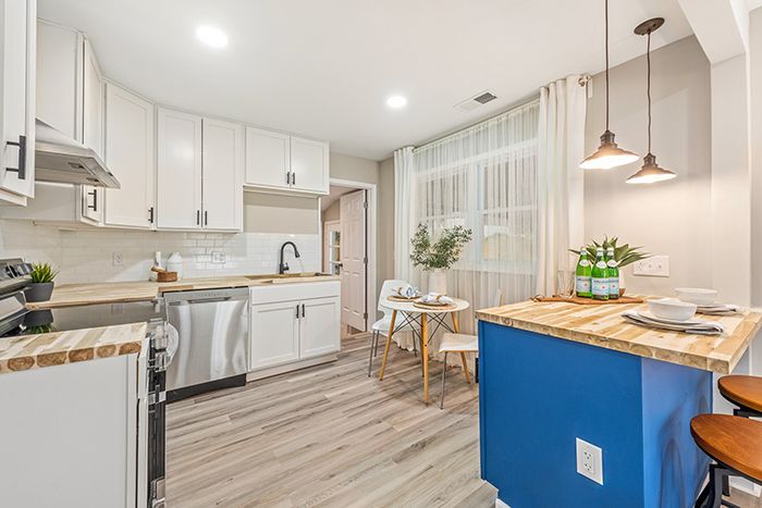 Why we love it: This renovated home has butcher block kitchen countertops to add to the modern style.