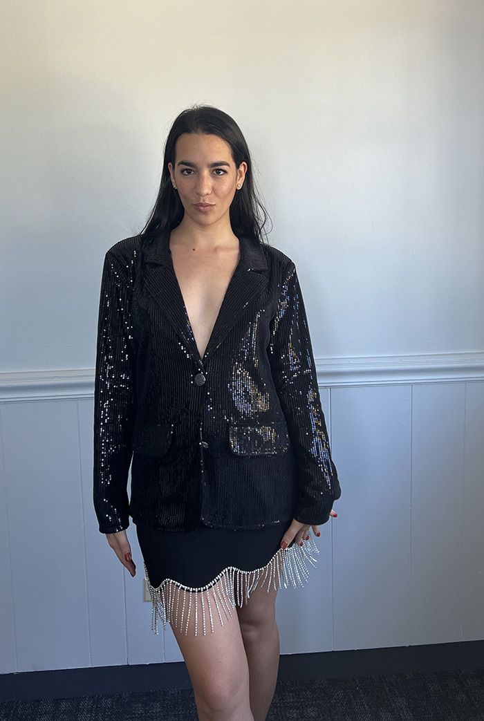 - A sparkly blazer and black mini skirt.