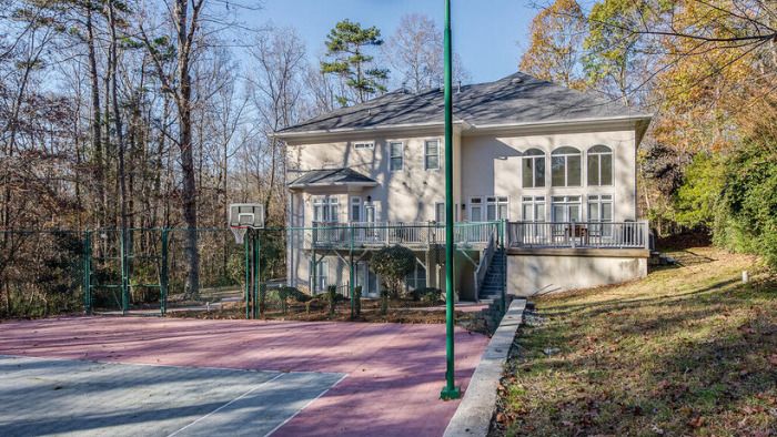 - Notable features: large primary bedroom, guest suite, large kitchen, 2-story great room, large deck area, private lot, full-size tennis court, media room, double-sided fireplace and basement with second living area.