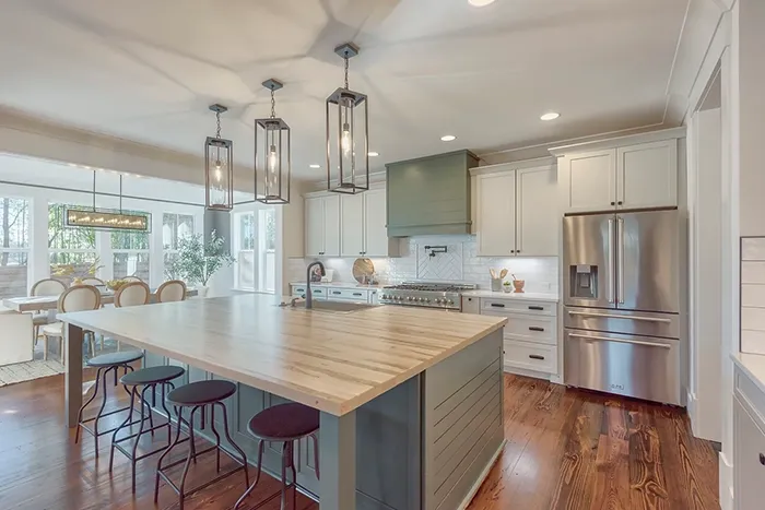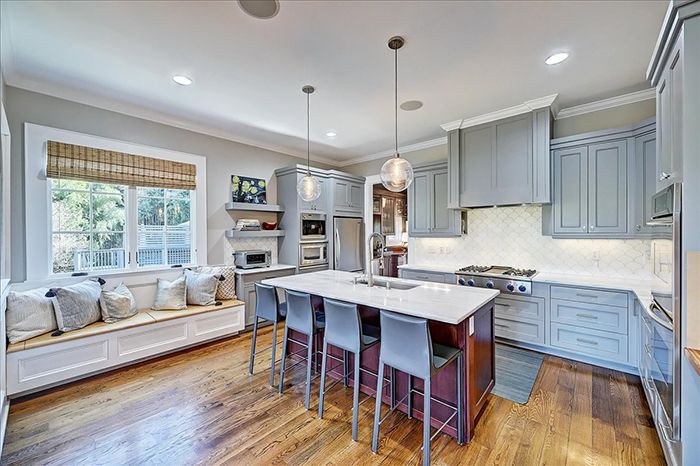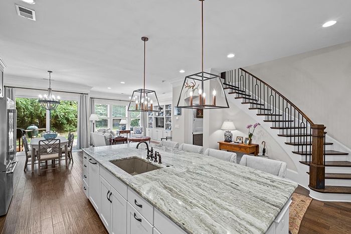 Why we love it: The calming color palette in the kitchen compliments the stone fireplace in this home’s open layout.