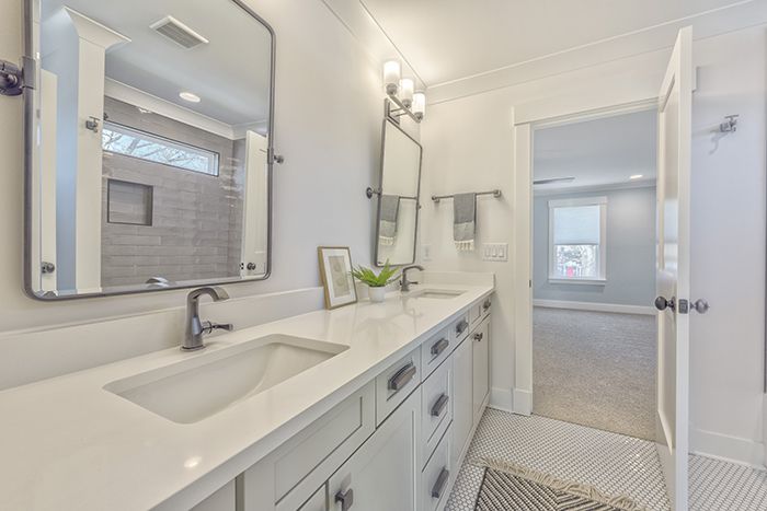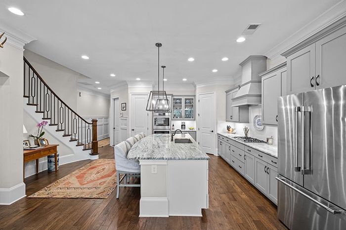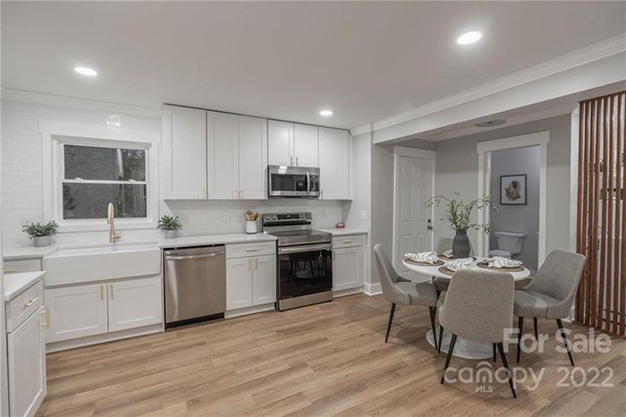 - Notable features: brick exterior, spacious living room, open floor plan, quartz countertops, stainless steel appliances, subway tile kitchen backsplash, sleek white cabinets and gold hardware.