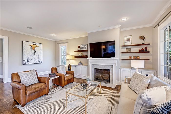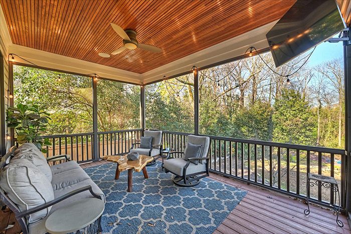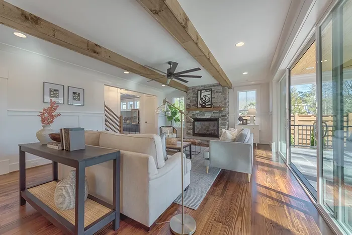 - Notable features: hardwood floors, open floor plan, modern light fixtures, built-in shelving, fireplace, exposed beams, screened porch, stainless steel appliances, large walk-in closet and mud room.