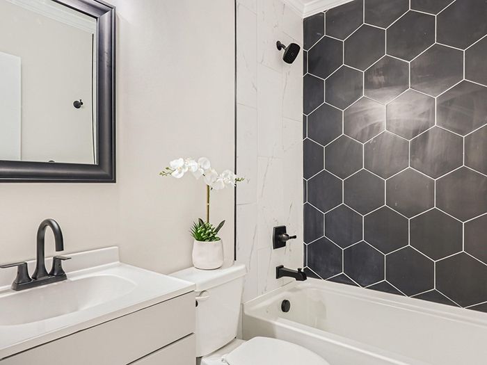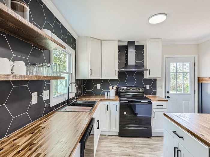 Why we love it: This 1950s home has renovated touches including exposed wood and a geometric kitchen backsplash.