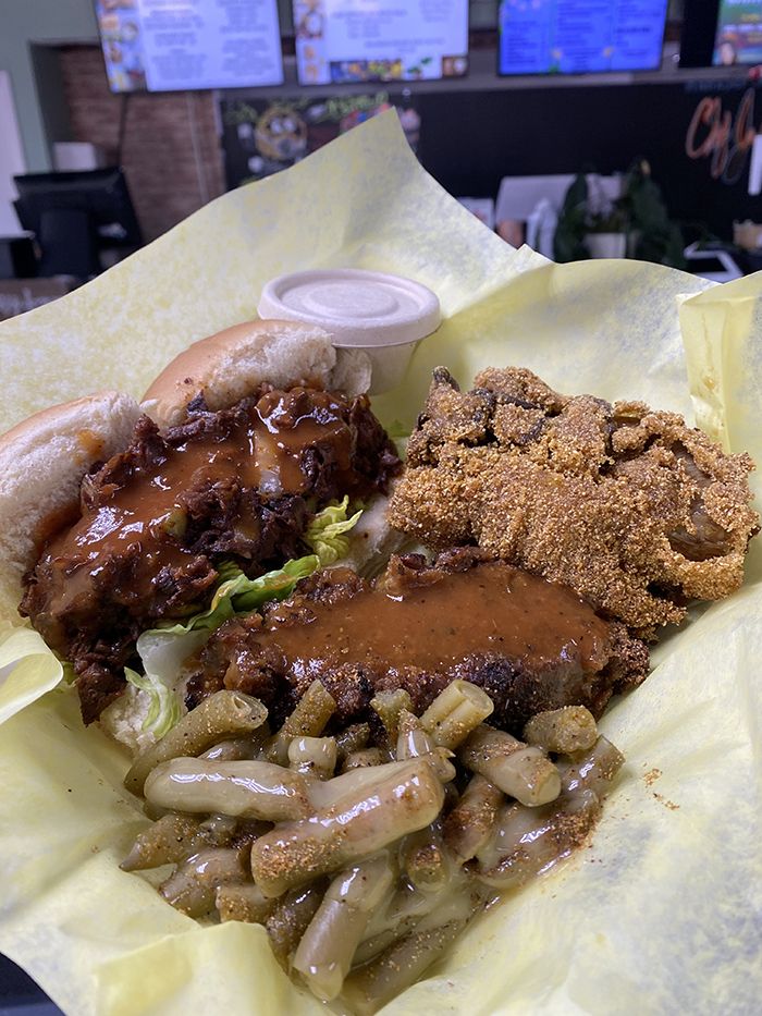 - Popular dishes include a sea moss-infused French toast, jackfruit Philly cheesesteak, a meatless meatloaf and sweet potato pie.