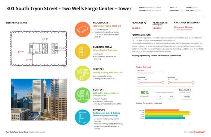 - Gensler created a tool that assesses office buildings’ compatability “for adaptive reuse, conversion and redevelopment.” Based on a number of factors, from the shape of the 301 S. Tryon tower to its access to transit, the firm concluded that the tower is a strong candidate for conversion.