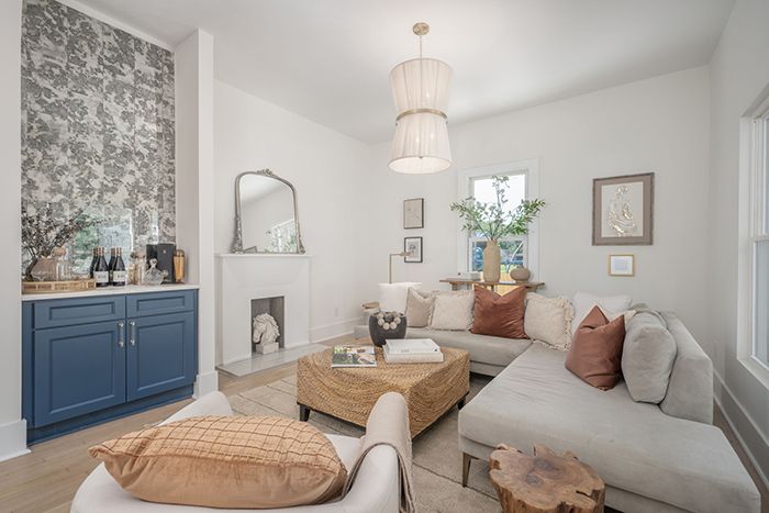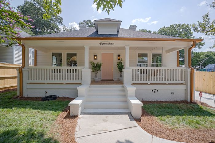 - Notable features: large shaded front porch, arch walkways, fireplace, bar nook, modern light fixtures, gold hardware and fenced-in backyard.