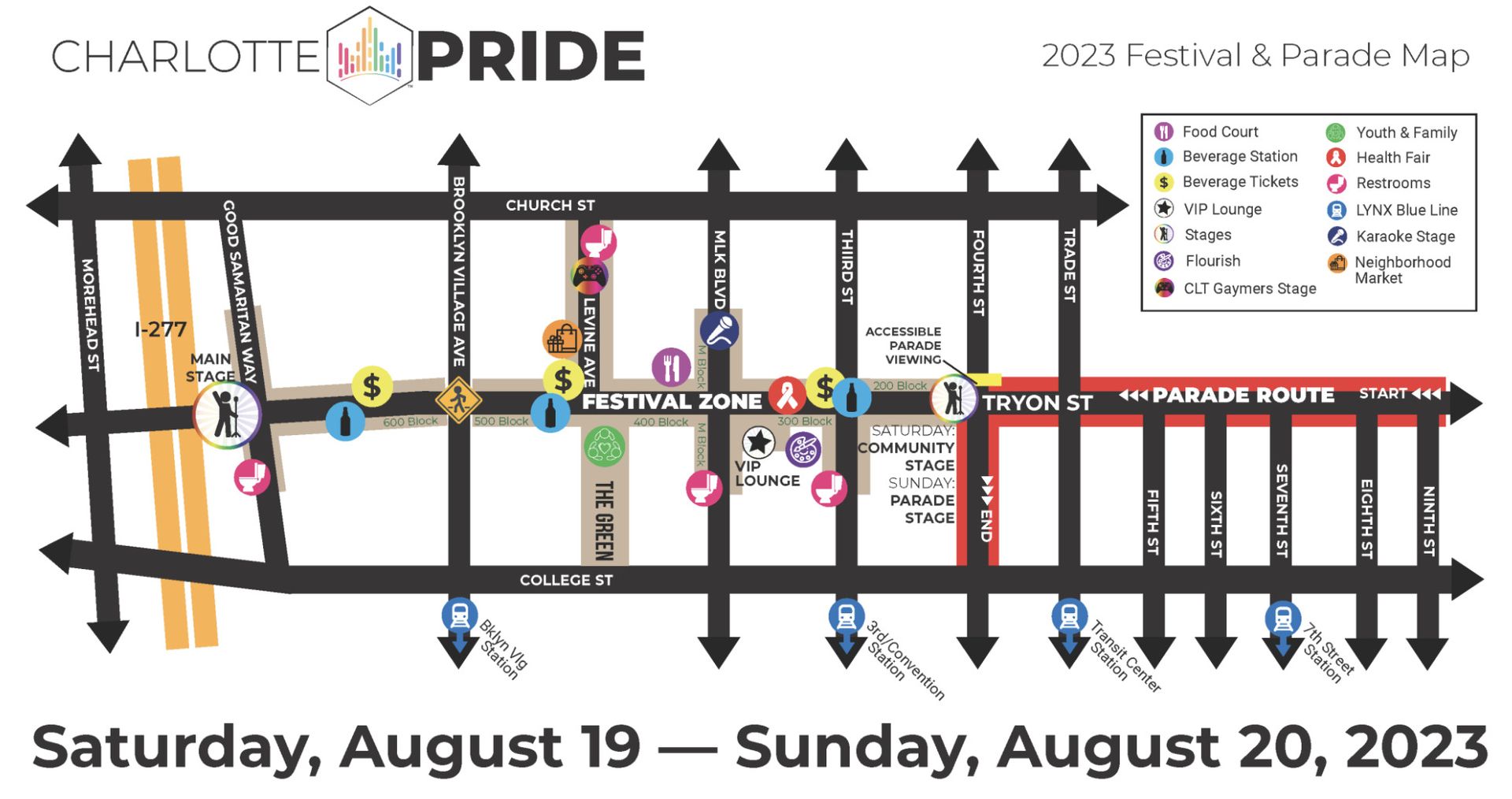 - Along with the popular parade, Charlotte Pride includes a festival Saturday on South Tryon starting at 12:30pm featuring local and national entertainers, musicians, bands, and hundreds of vendor booths, including art exhibits, local nonprofits, retailers and a food court, per Charlotte Pride.