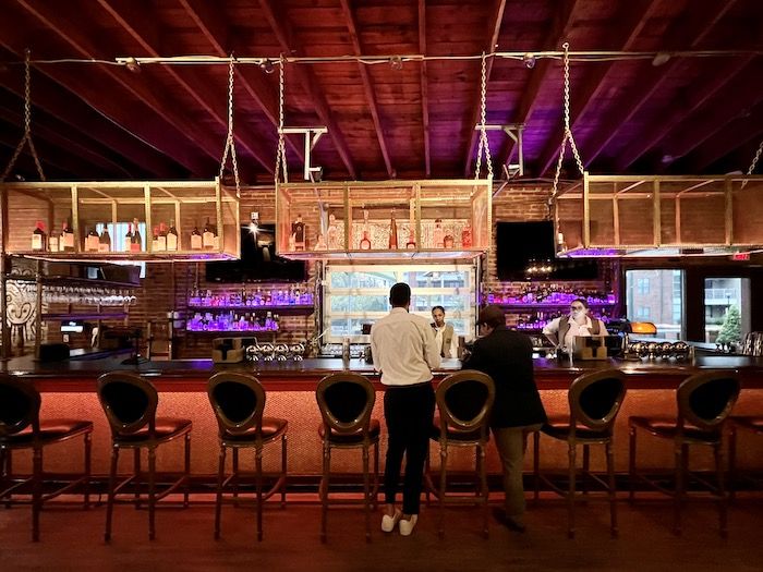 - Inside, the restaurant is divided in two by velvet ropes — a cocktail lounge side with couches and a huge bar as its centerpiece, and a separate sit-down restaurant-style side.