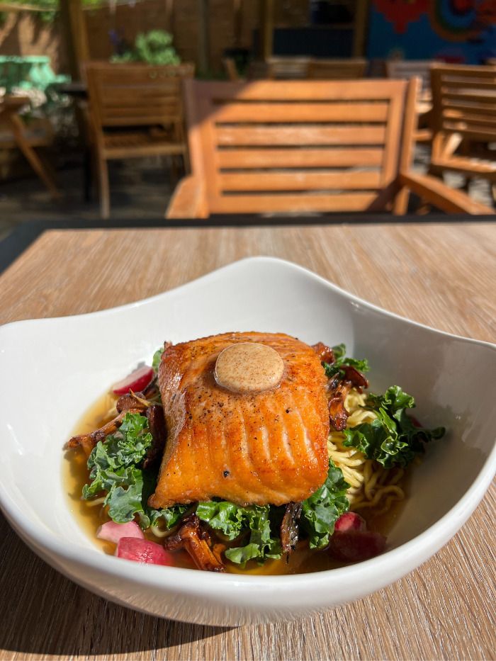 - The salmon ramen and duck both use greens from the farm, and the chef’s board featured squash from the farm.