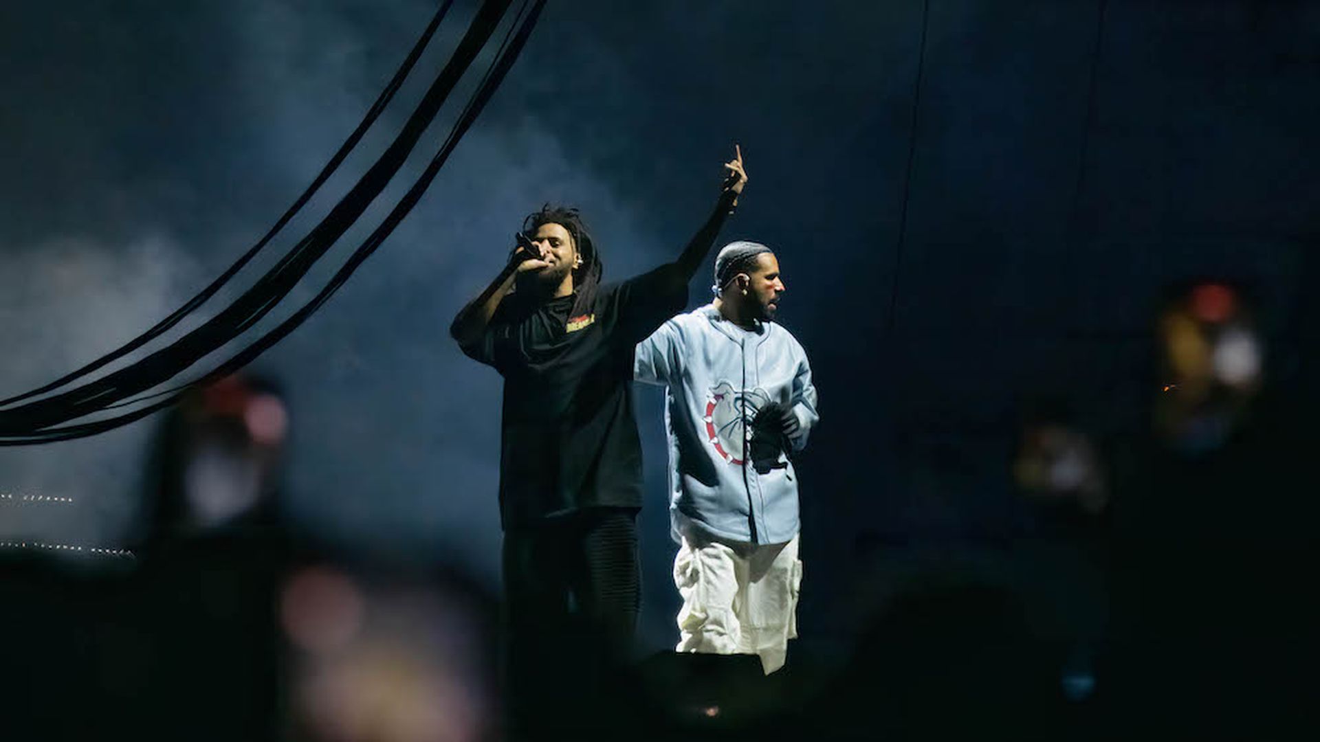 RALEIGH, NORTH CAROLINA - APRIL 02: J. Cole (L) and Drake (R) perform during the Dreamville Festival at Dorothea Dix Park on April 02, 2023 in Raleigh, North Carolina. (Photo by Astrida Valigorsky/WireImage)