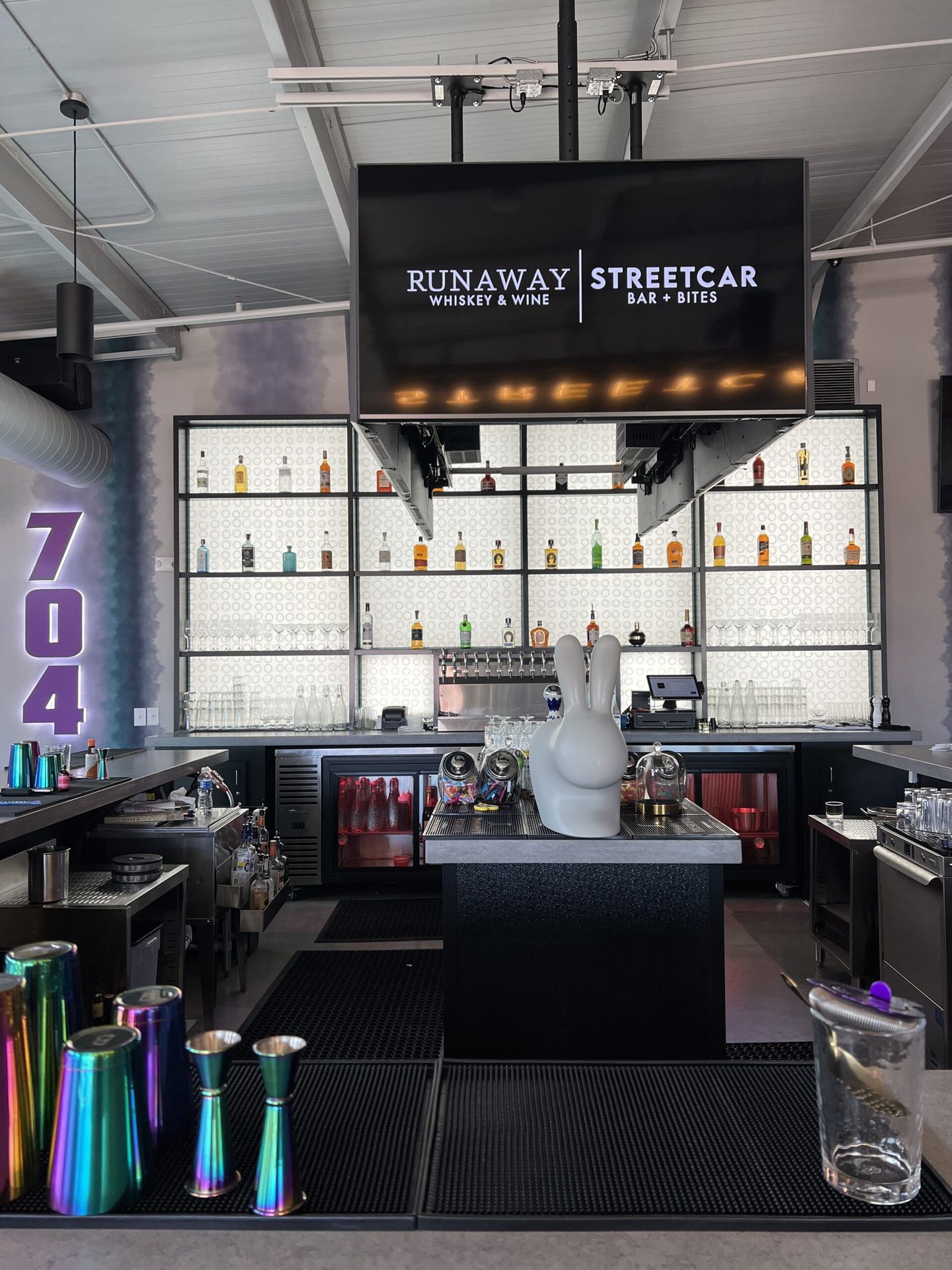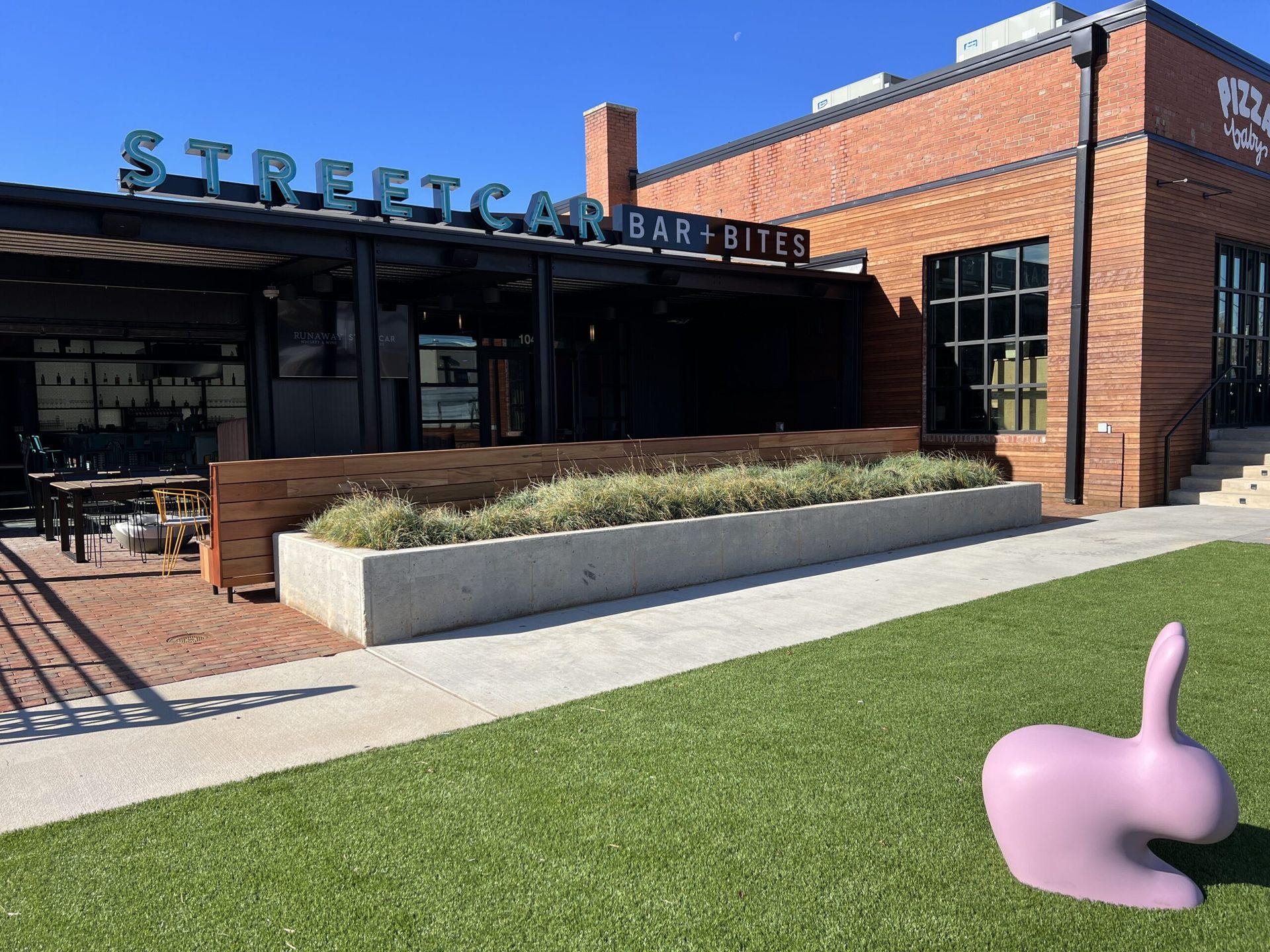 - The interior is designed around a central bar, with additional booth and table seating. There’s also patio seating (and you can’t miss the bunny rabbit chairs on the front lawn).