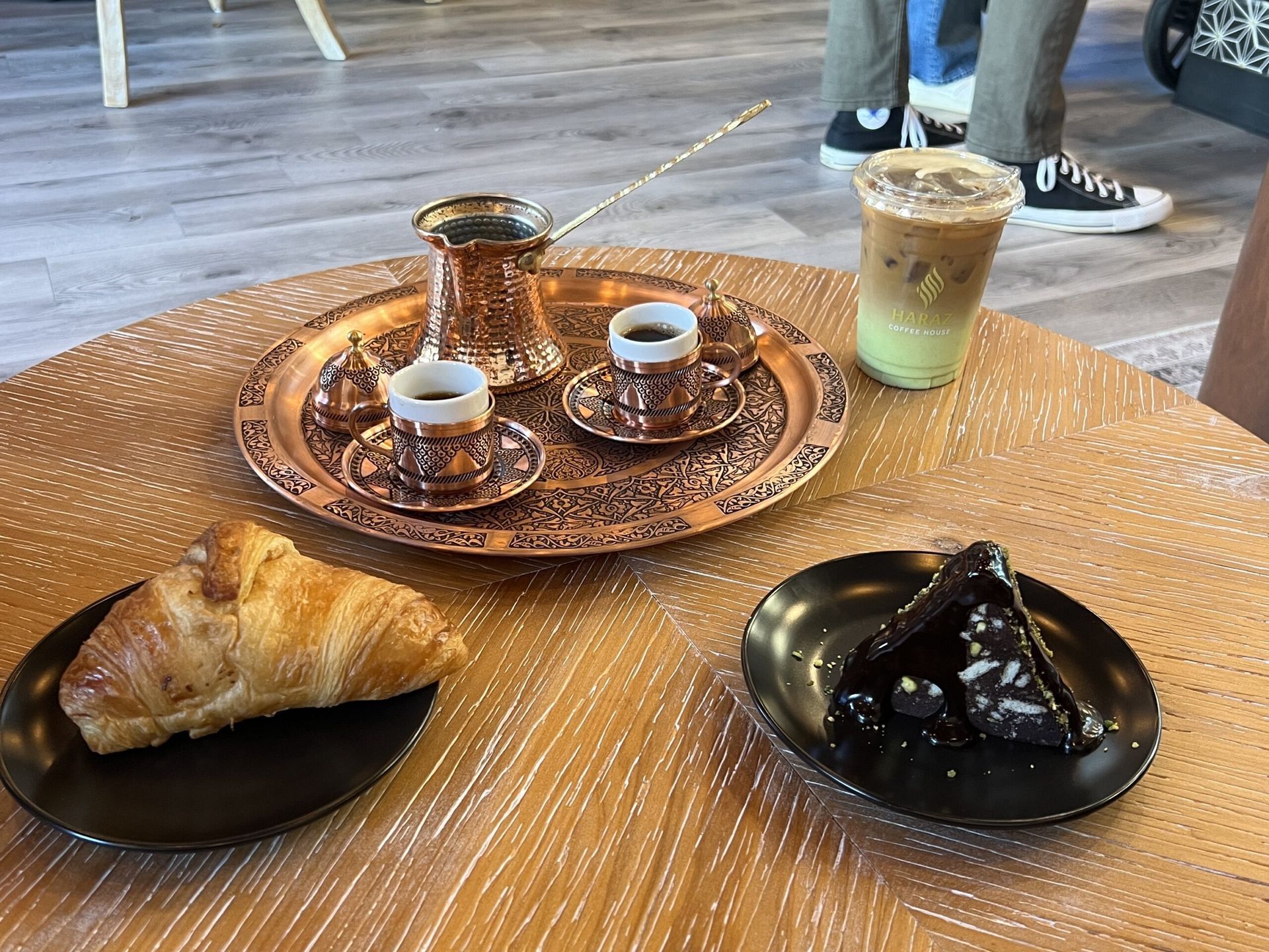 We ordered the Turkish coffee pot ($14), iced pistachio latte ($7.85), croissant ($5) and pistachio mosaic cake ($7.50).