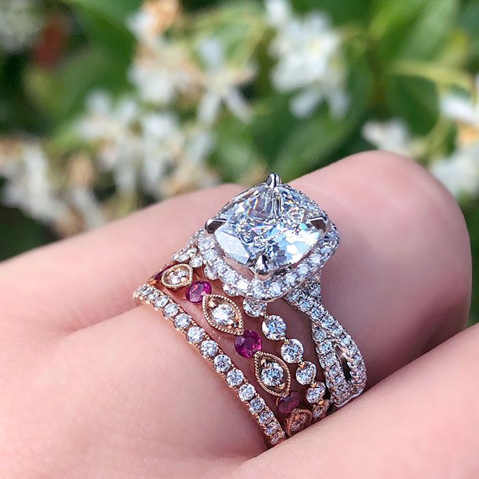 “Charlotte brides can also showcase their unique style by creating custom wedding band stacks. We see brides now mix-and-matching their metals as well as incorporating colored gemstones into their stack. Brides can add bands over the years to celebrate milestones that will create a memory for a lifetime!” – Dovy Klarberg, Diamonds Direct SouthPark