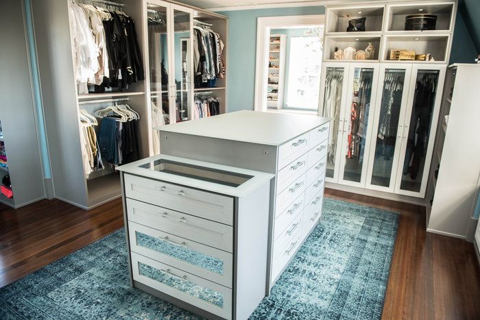 The new closet features a large, back-painted glass top island. Four reading benches. Drawers filled with jewelry trays. Special lighting. Shelves to display hats and other decorative items.