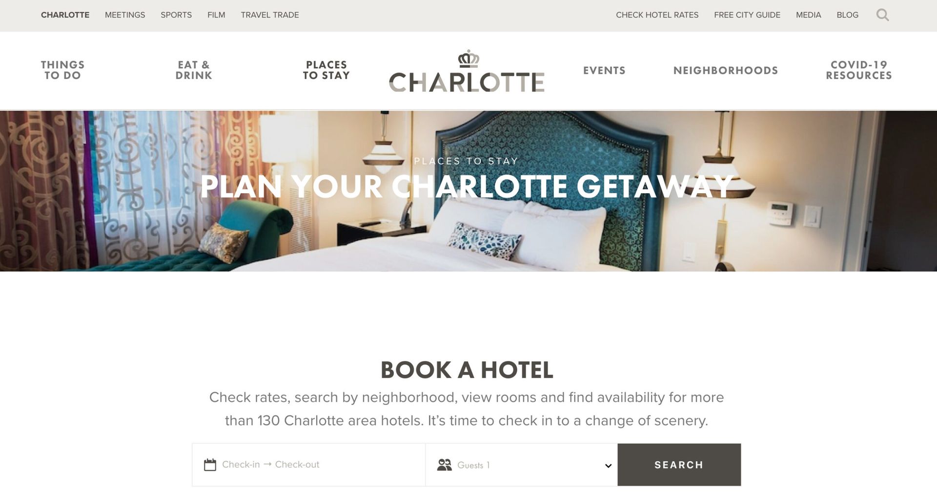 The booking portal lets you filter by neighborhood, check rates, view rooms and find availability for more than 130 Charlotte area hotels.