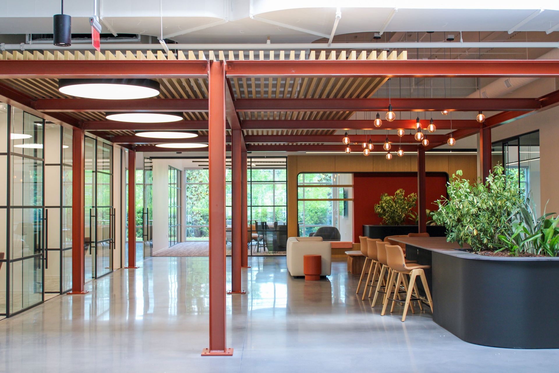 An example: Located alongside the Lower McAlpine Creek Greenway, the newly-renovated Rushmore Five isn’t your typical office space. It was built with creativity and inspiration in mind, featuring a design scheme of modern furniture, earth tones, greenery and wood accents, plus an indoor pergola, on-site showers and a private outdoor patio.