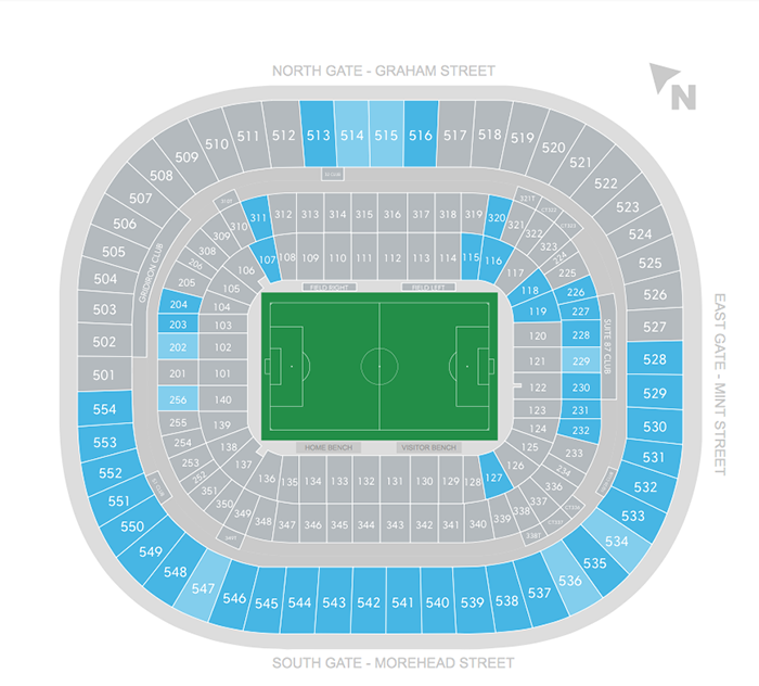 The match will take place at Bank of America Stadium, so you’ll have the usual options of public and private parking decks. The stadium reccomends the Mint Street Parking Facility, which is adjacent to the venue. Parking Panda has options starting at $15, but ones that are closer to the stadium are going for about $20-$30.