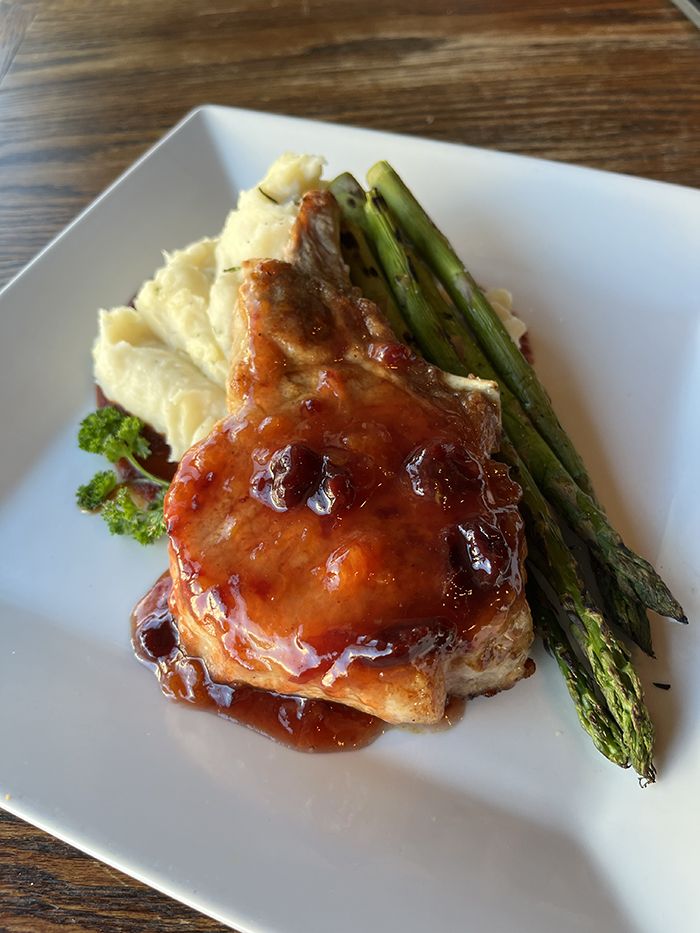 Pork chop: Bone-in with mashed potatoes and asparagus.