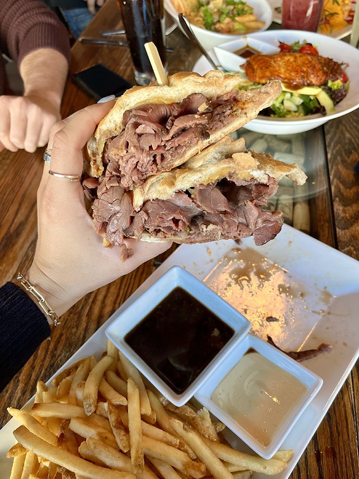 The Tavern Dip: Thinly sliced house roasted prime rib and smoked gouda on a baguette. Served with rosemary au jus and horseradish cream sauce on the side.