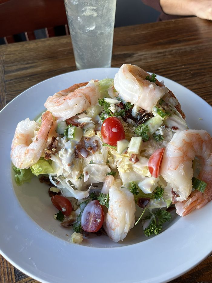 Wedge Salad: Iceberg lettuce, bacon, blue cheese crumble, tomatoes and blue cheese dressing.