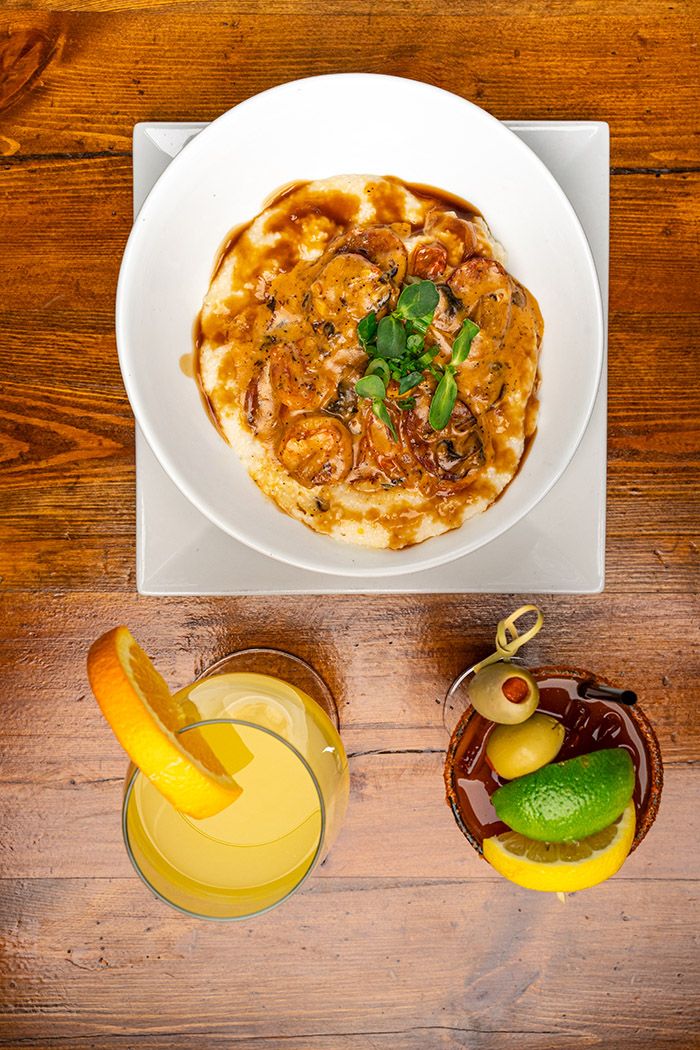 - Shrimp & Grits: Pepper jack grits, andouille sausage, mushroom, tomato, caramelized onion, Cajun cream sauce.