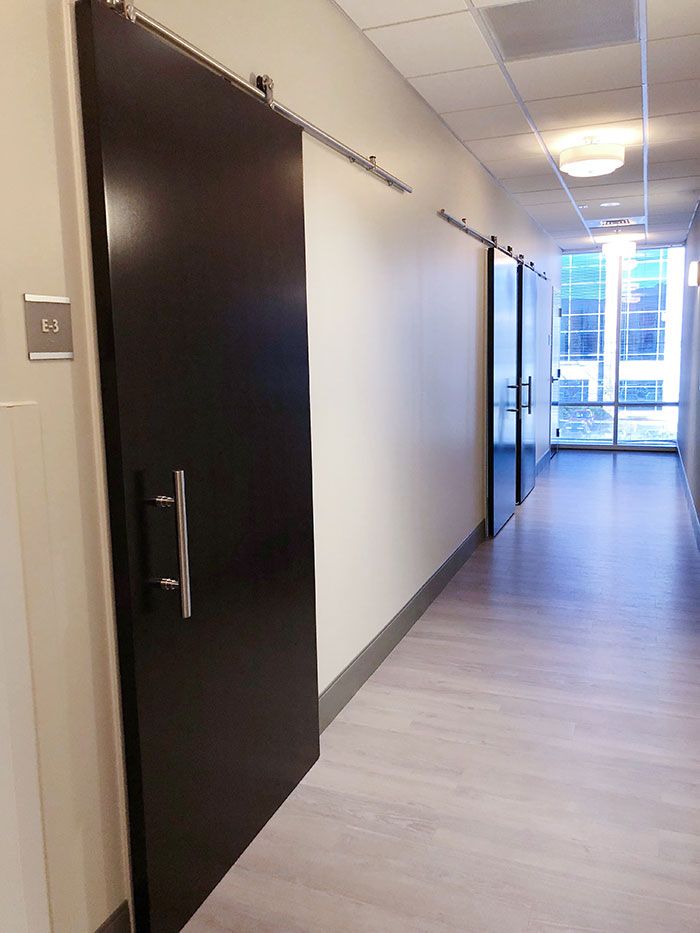 Modern, sliding barn doors, comfortable furniture, interesting photographs and artwork, and non-fluorescent lighting all add to the home-away-from-home vibe.