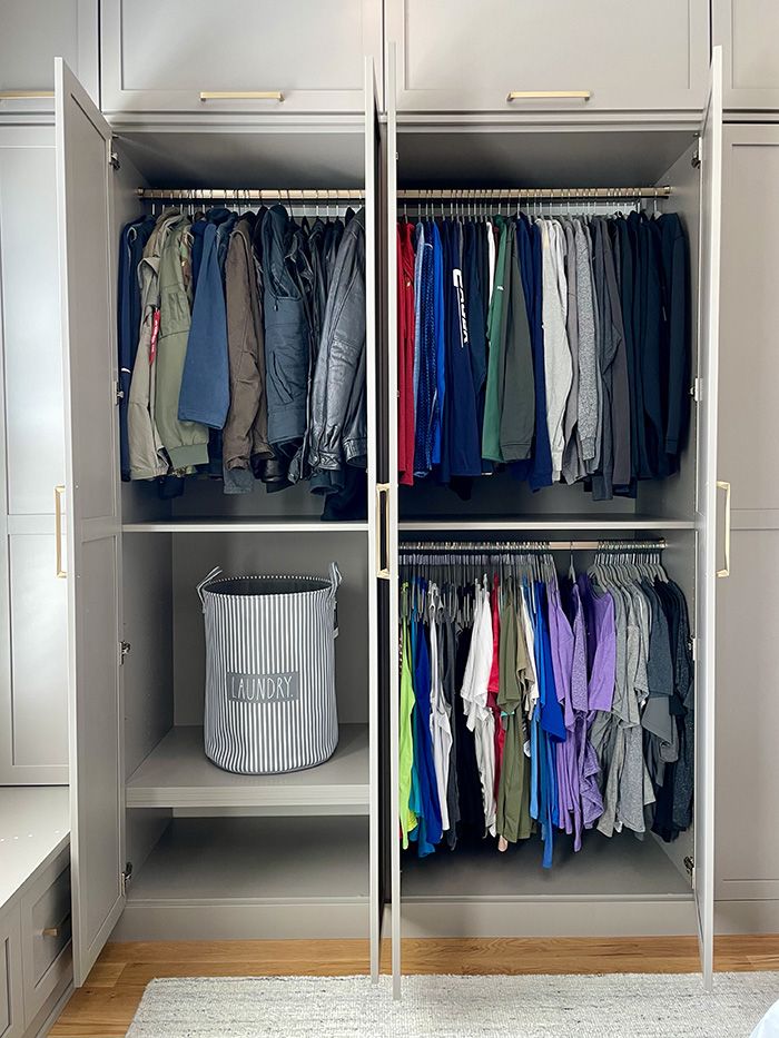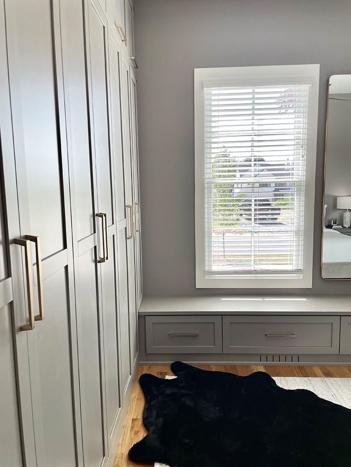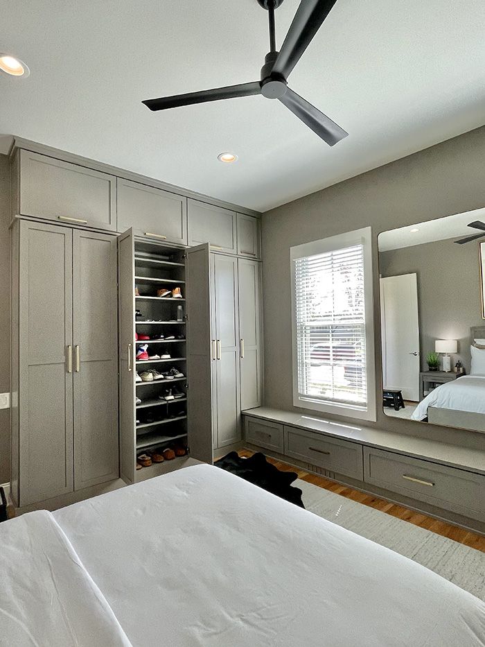 - This allowed for separate storage areas for shoes and accessories on the left wall, clothing organization on the right, and a window bench connecting the two for a flawless, built-in design.