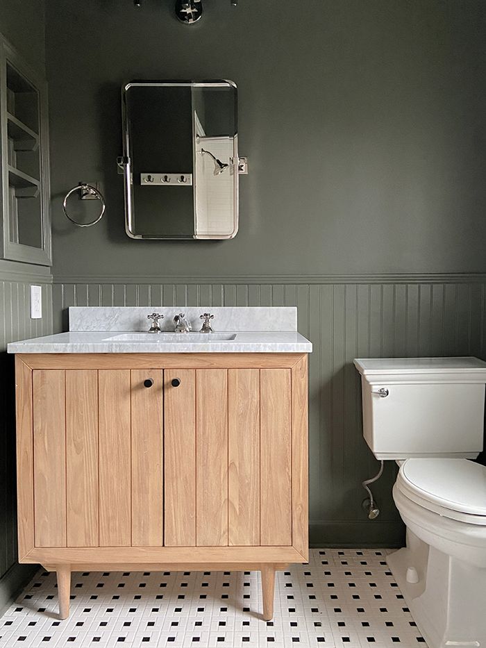 Then, it’s probably the powder room. They let me get a little bit funkier with it and do a full tile treatment with black ceilings.