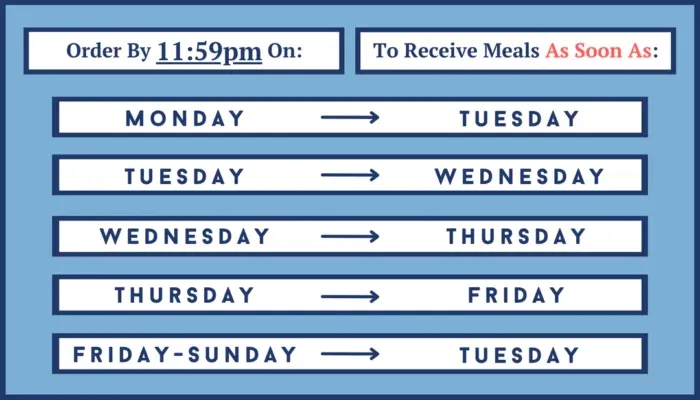 The deets: Food is delivered Tuesday – Friday. Here are the order cutoffs: