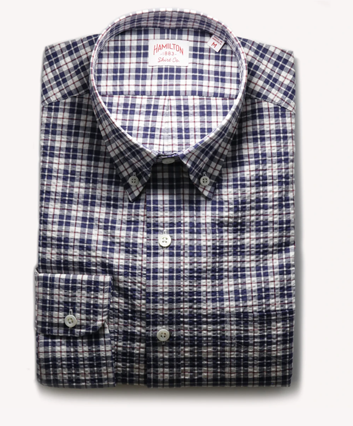Hamilton sport shirt in navy burgundy plaid ($225)