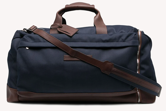 Brunello Cucinelli canvas holdall in navy & brown ($4,295)