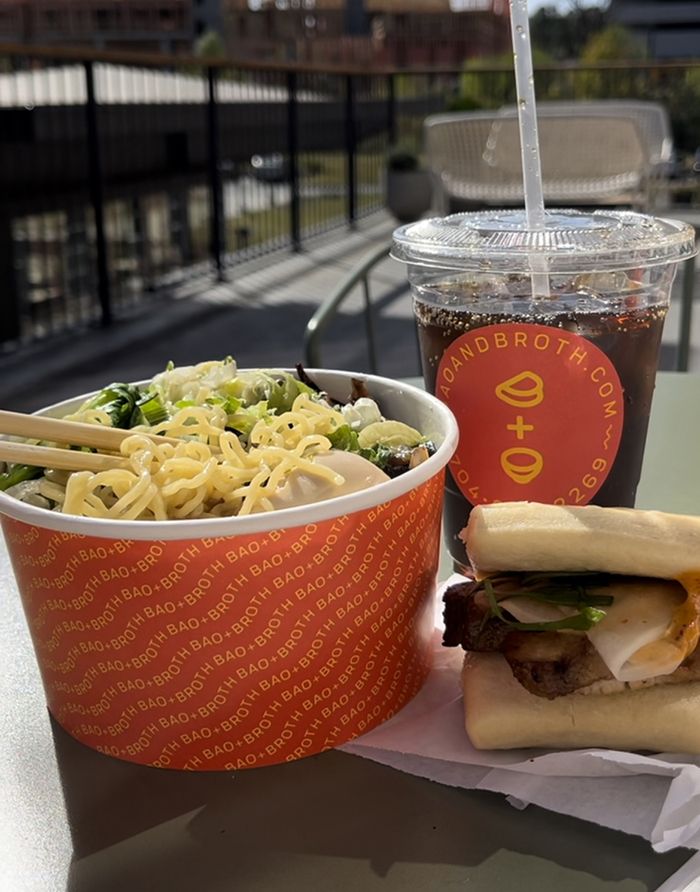 Bao and Broth is Optimist Hall’s small-but-mighty ramen and bun stall from Larry Schreiber, the chef behind Good Food on Montford’s wildly popular steamed buns.