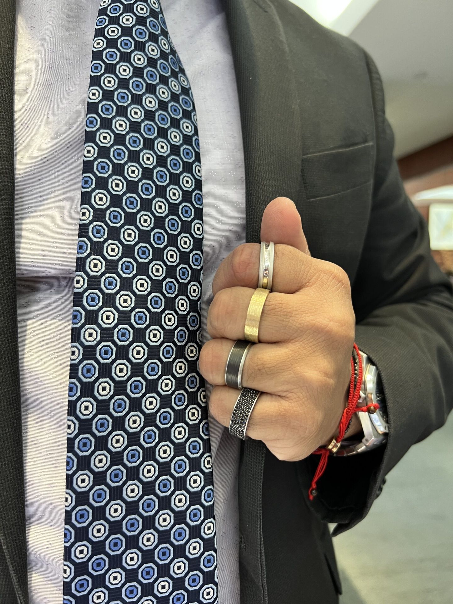 Some examples: Finishes can be matte, engraved, milgrain, patterned, brushed and more. Titanium, platinum, and palladium are becoming more popular metal choices, too.