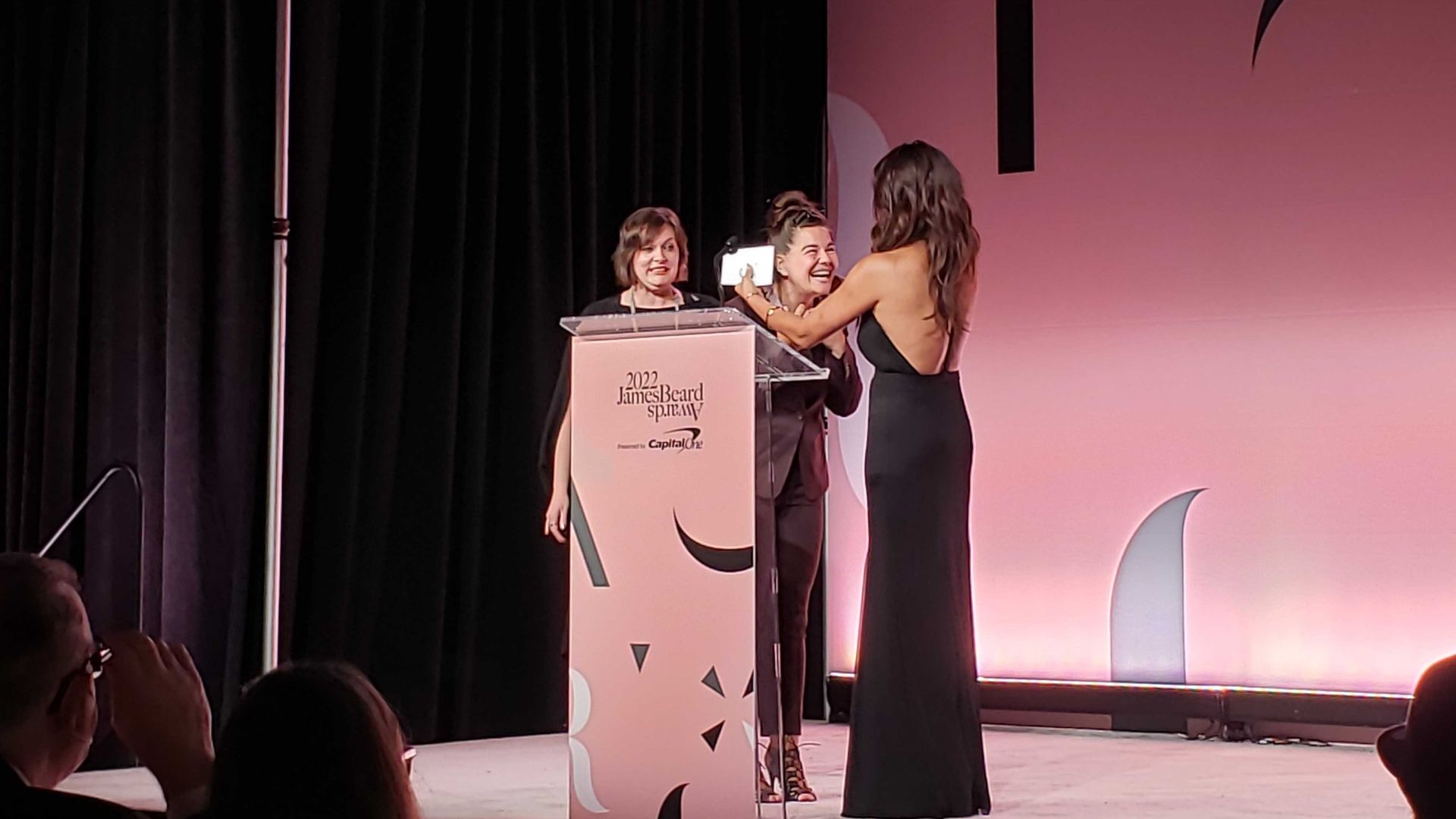 Emma Janzen and Julia Momosé accept Beard awards from Padma Lakshmi on Saturday night at Columbia College. Photo: Monica Eng/Axios