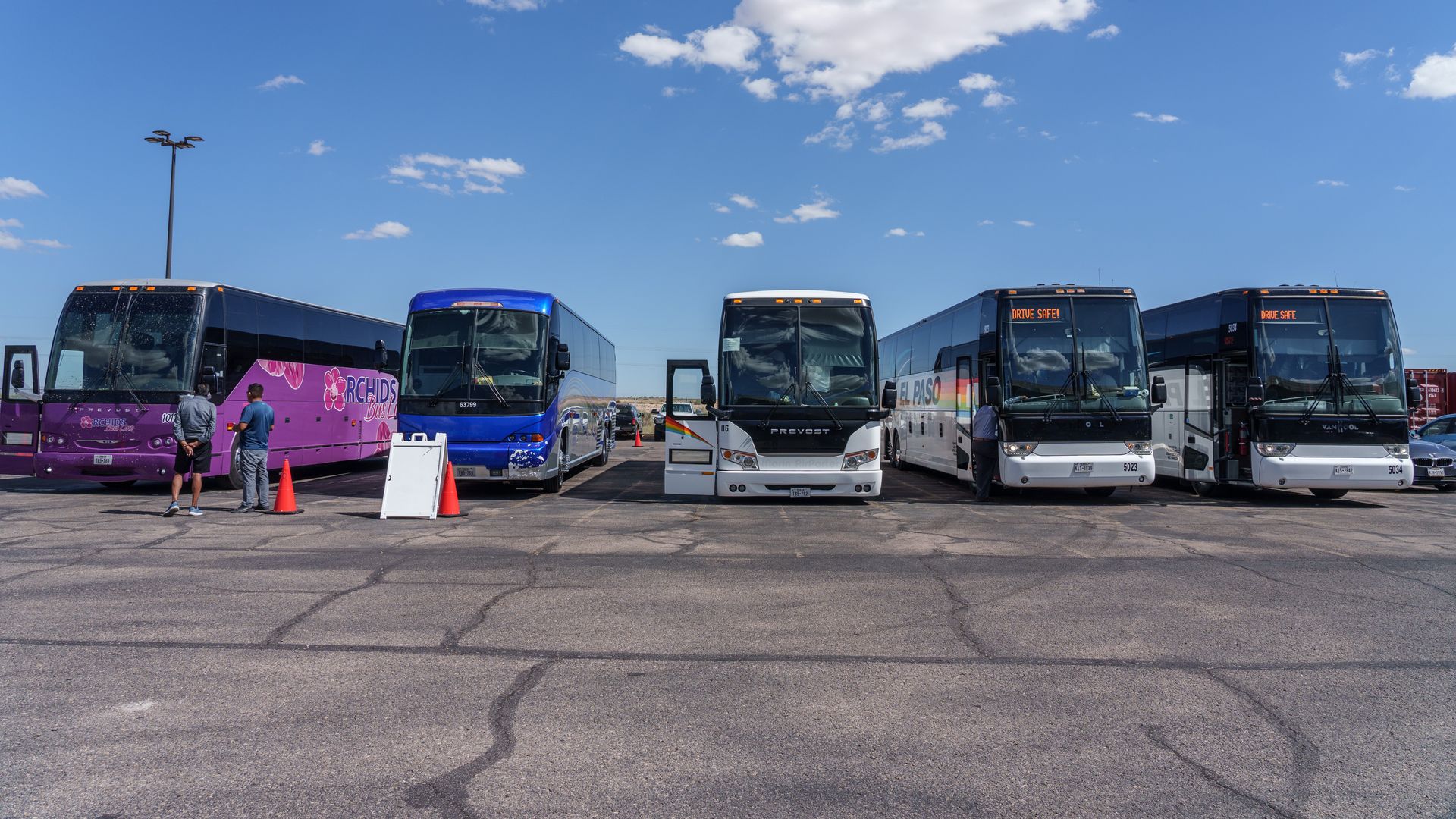 Chartered buses for transporting migrants to Chicago are parked outside the Migrant Welcome Center in El Paso, Texas, in September 2022. Photo: Paul Ratje/Bloomberg via Getty Images