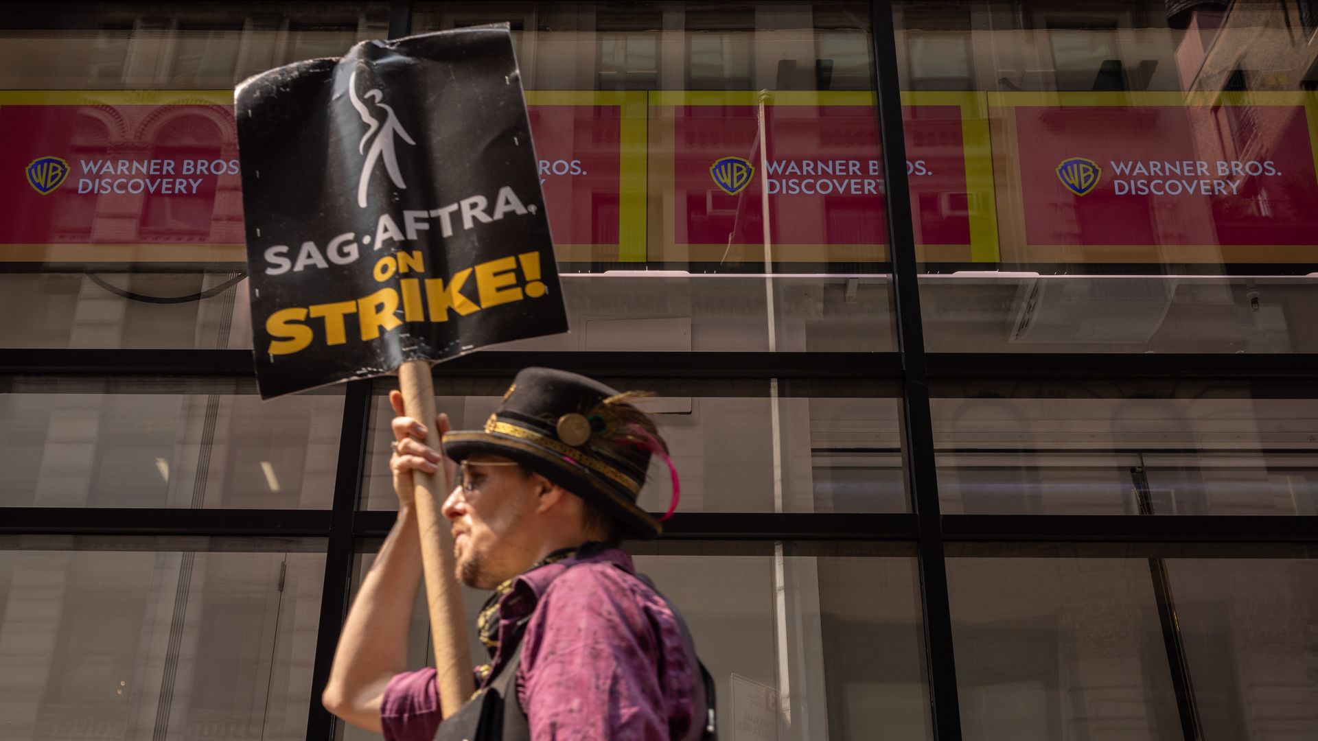 A Screen Actors Guild member on a picket line in New York City on July 17. Photo: Yuki Iwamura/Bloomberg via Getty Images