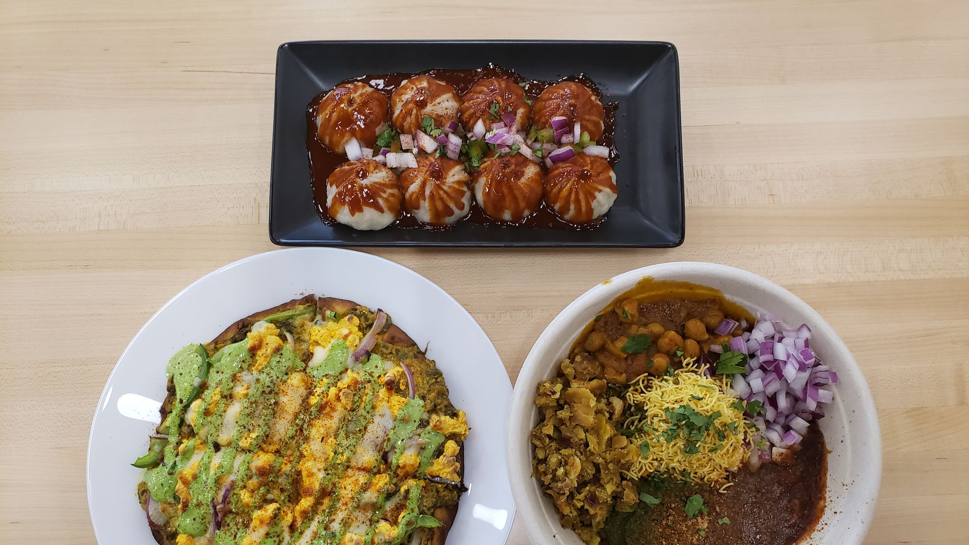 Firecracker momos, palak paneer pizza and the Chi-City chaat bowl. Photo: Monica Eng/Axios