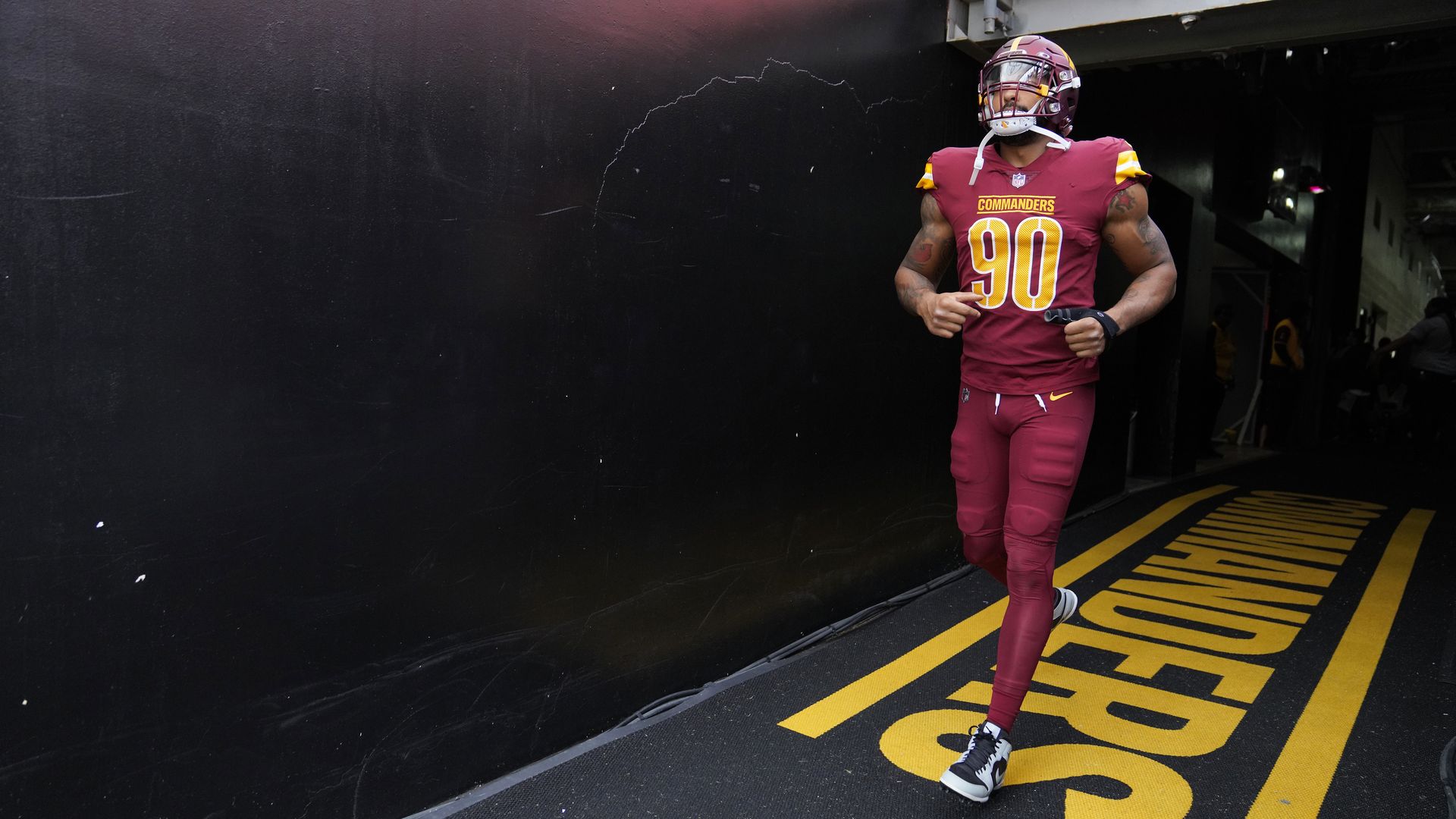 Here comes Montez Sweat! Sweat takes to the field prior to last week's game against the Philadelphia Eagles. Photo: Jess Rapfogel/Getty Images
