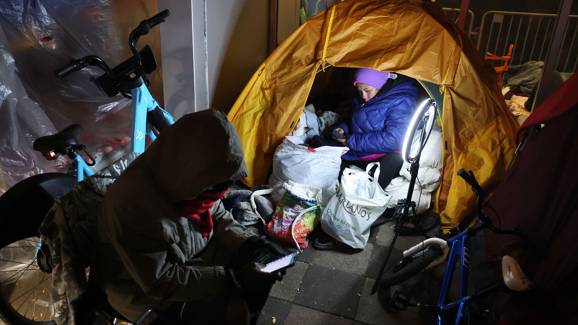 Yessica Karolina Badell Palmar, right, a migrant from Venezuela, in her tent outside the Chicago police 1st District station on South State Street. Photo: Terrence Antonio James/Chicago Tribune/Tribune News Service via Getty Images