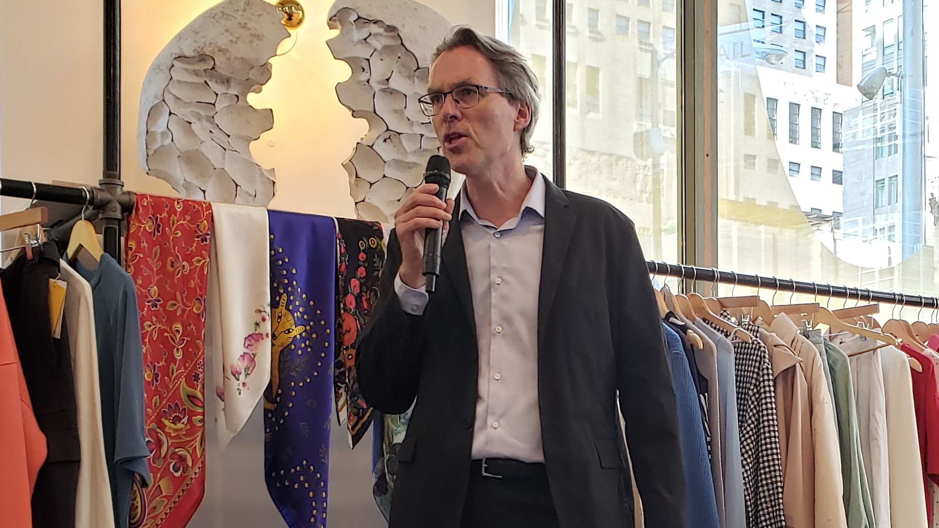 Michael Fassnacht at the opening of a World Business Chicago pop-up store in the Wrigley Building in summer 2023. Photo: Monica Eng/Axios