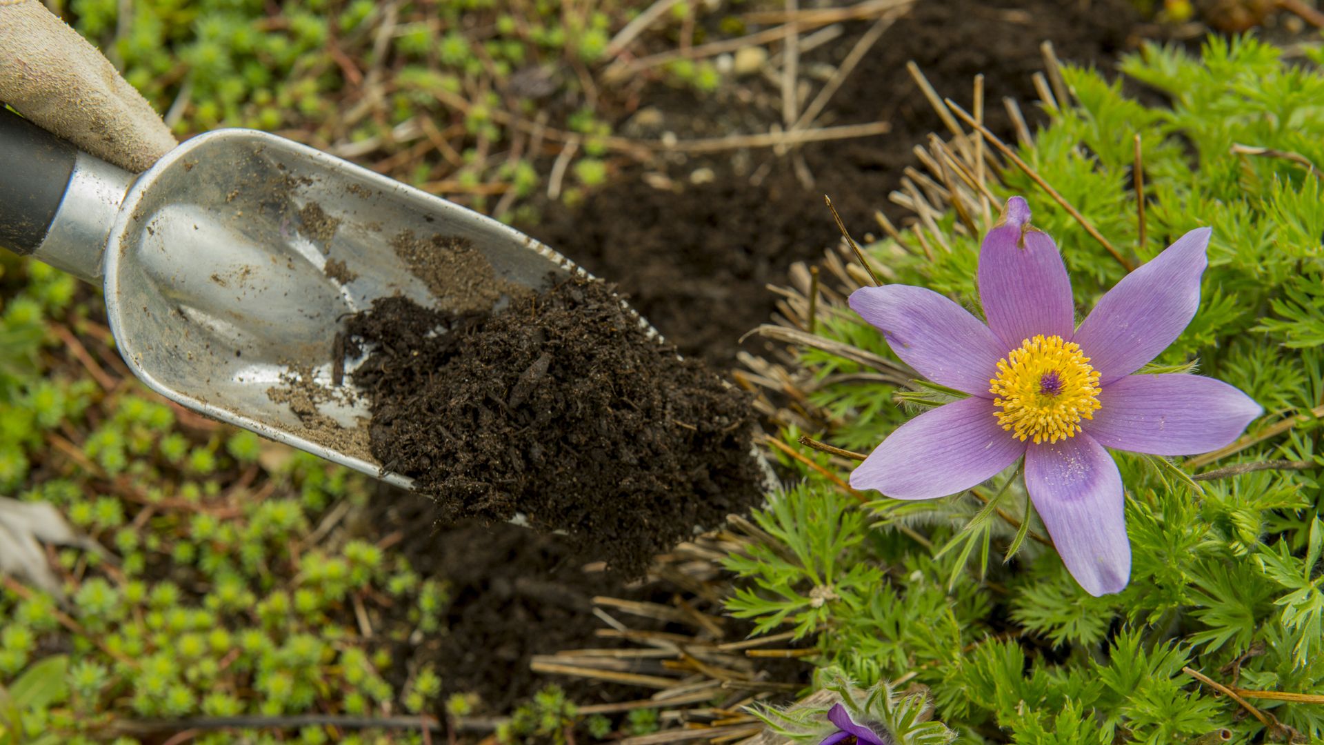 A gardener spreads compost around a Pasque flower. Photo: Wolfgang Kaehler/LightRocket via Getty Images