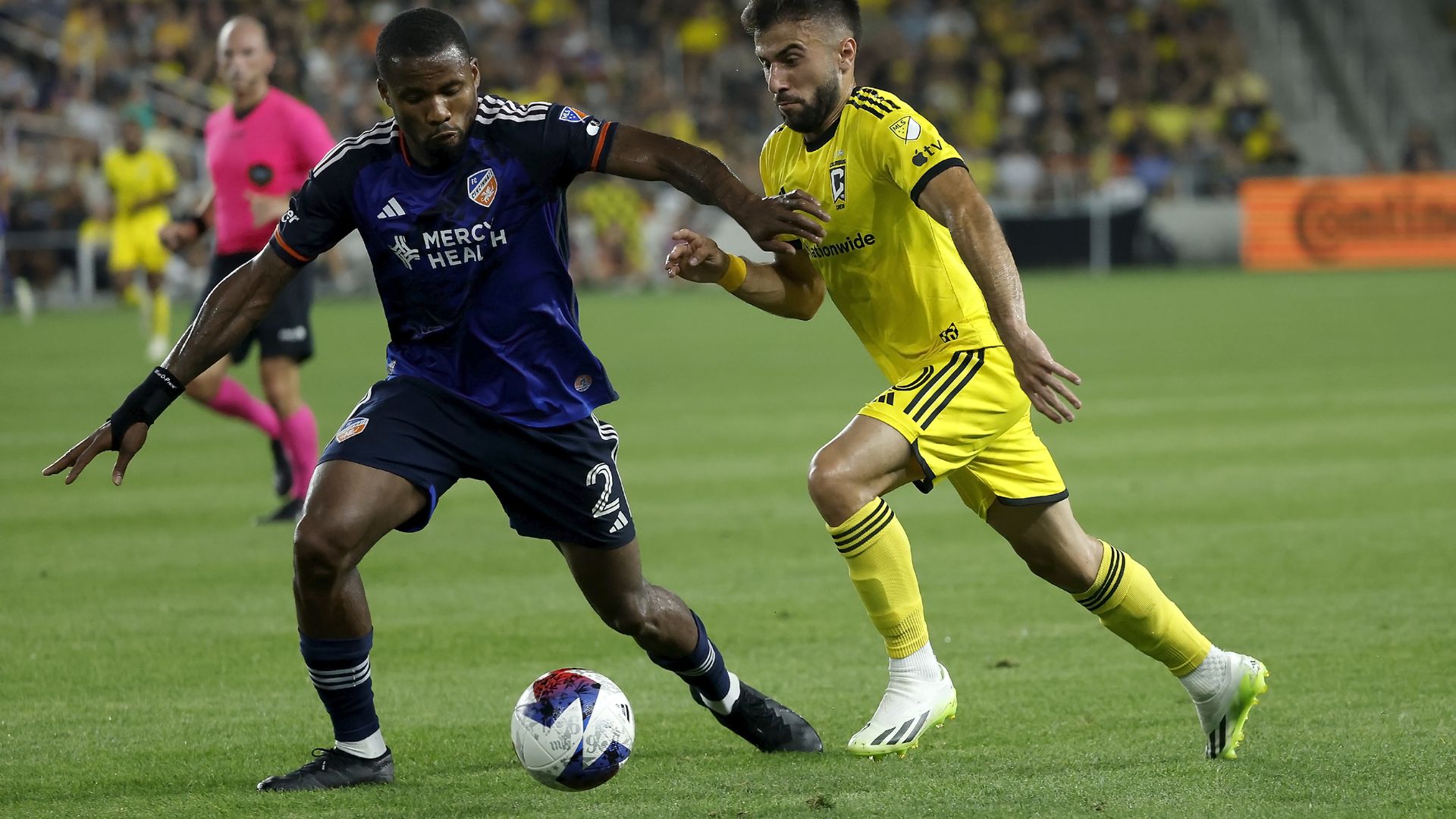 Columbus' Diego Rossi and Cincinnati's Alvas Powell battle for control of the ball during an August match. Photo: Kirk Irwin/Getty Images