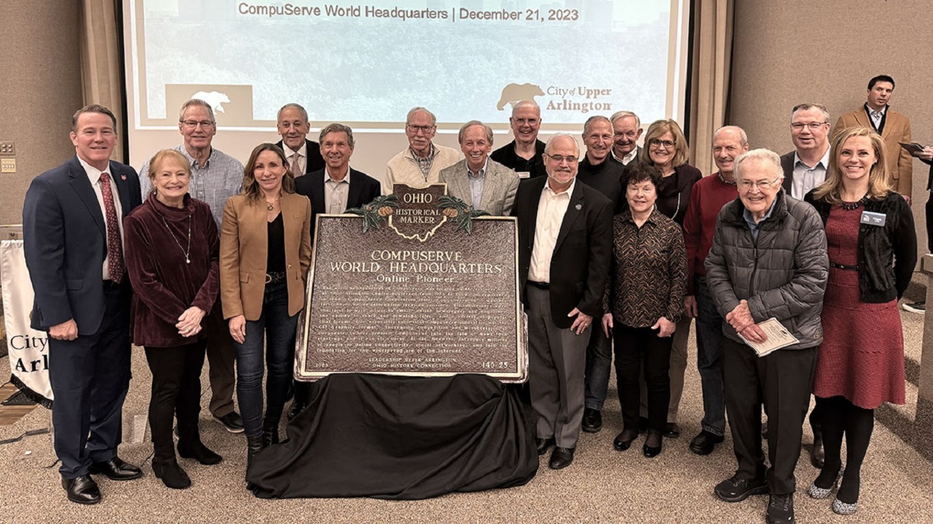 Attendees of the dedication ceremony for a "CompuServe World Headquarters" historical marker. Photo: Courtesy of the city of Upper Arlington