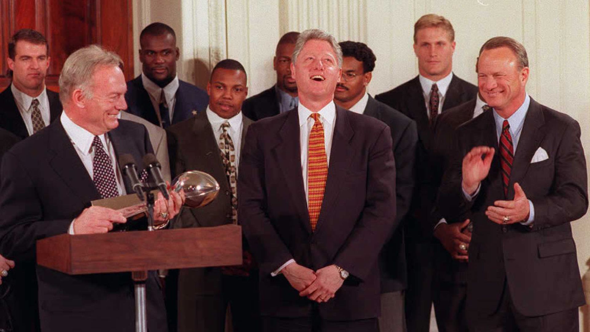 Just two boys from Arkansas, sharing a powerful laugh while Barry Switzer appaluds. Photo: Joyce Naltchayan/AFP via Getty Images