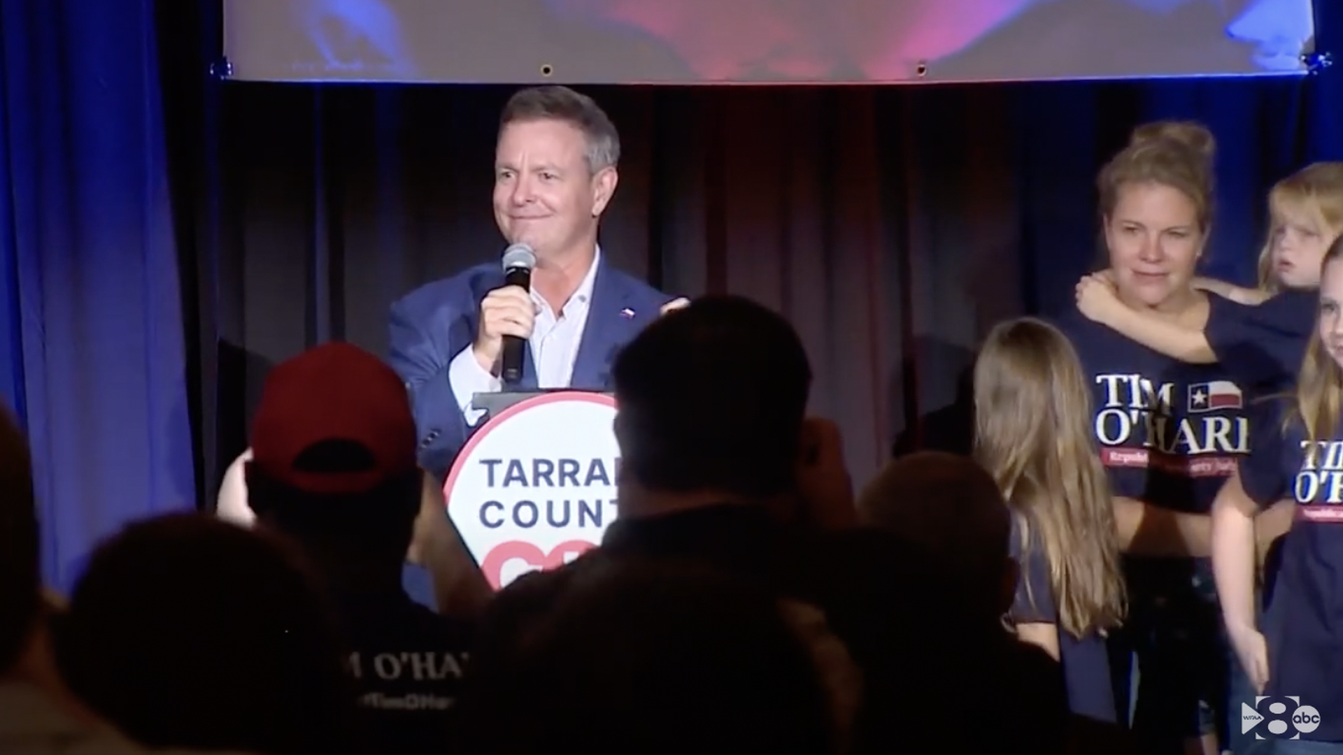 Tim O'Hare celebrates being elected Tarrant County judge at his victory party Tuesday night. Screenshot: WFAA