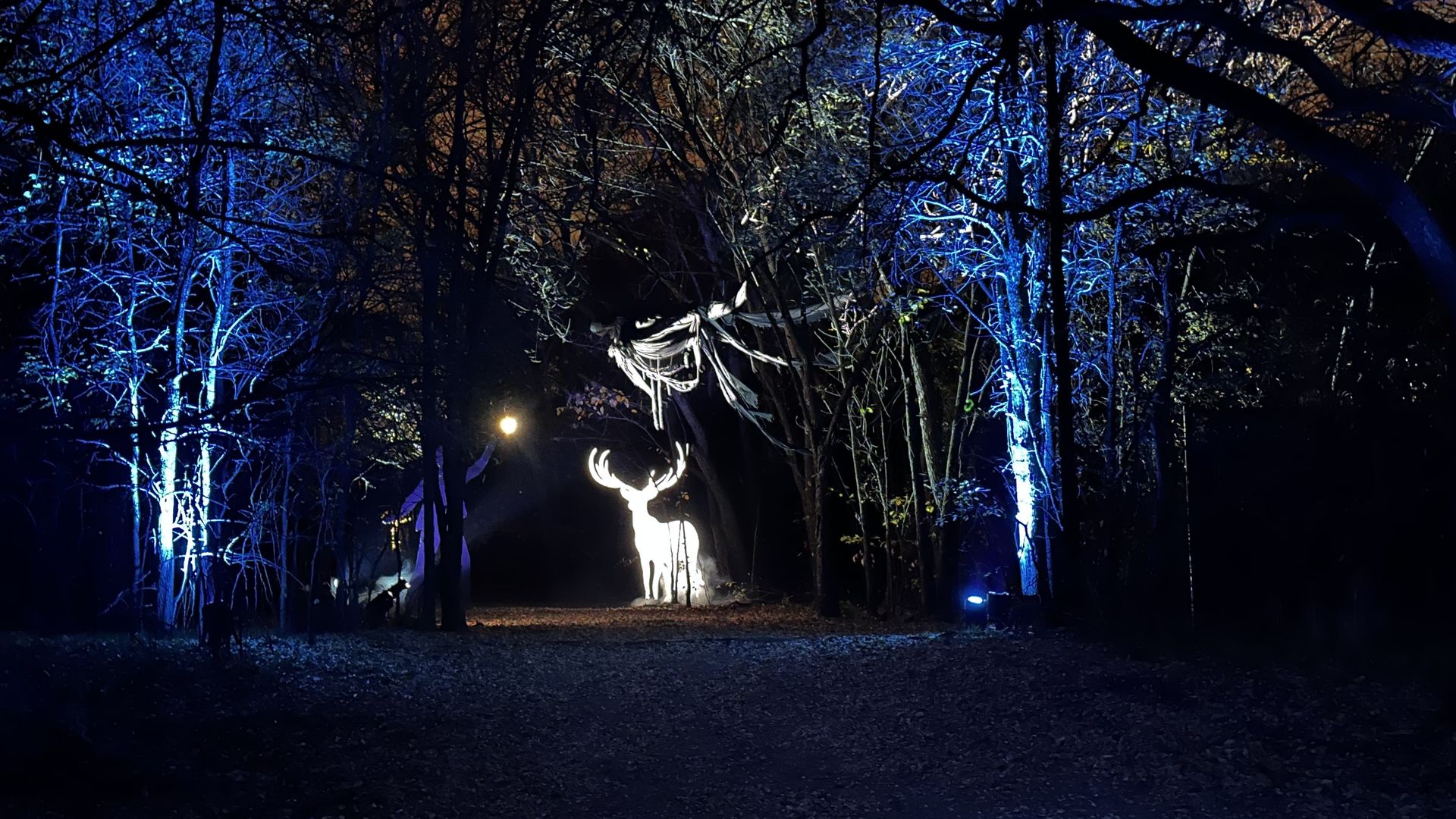- A sound system plays audio clips from the films and colored floodlights illuminate sections of the forest.
