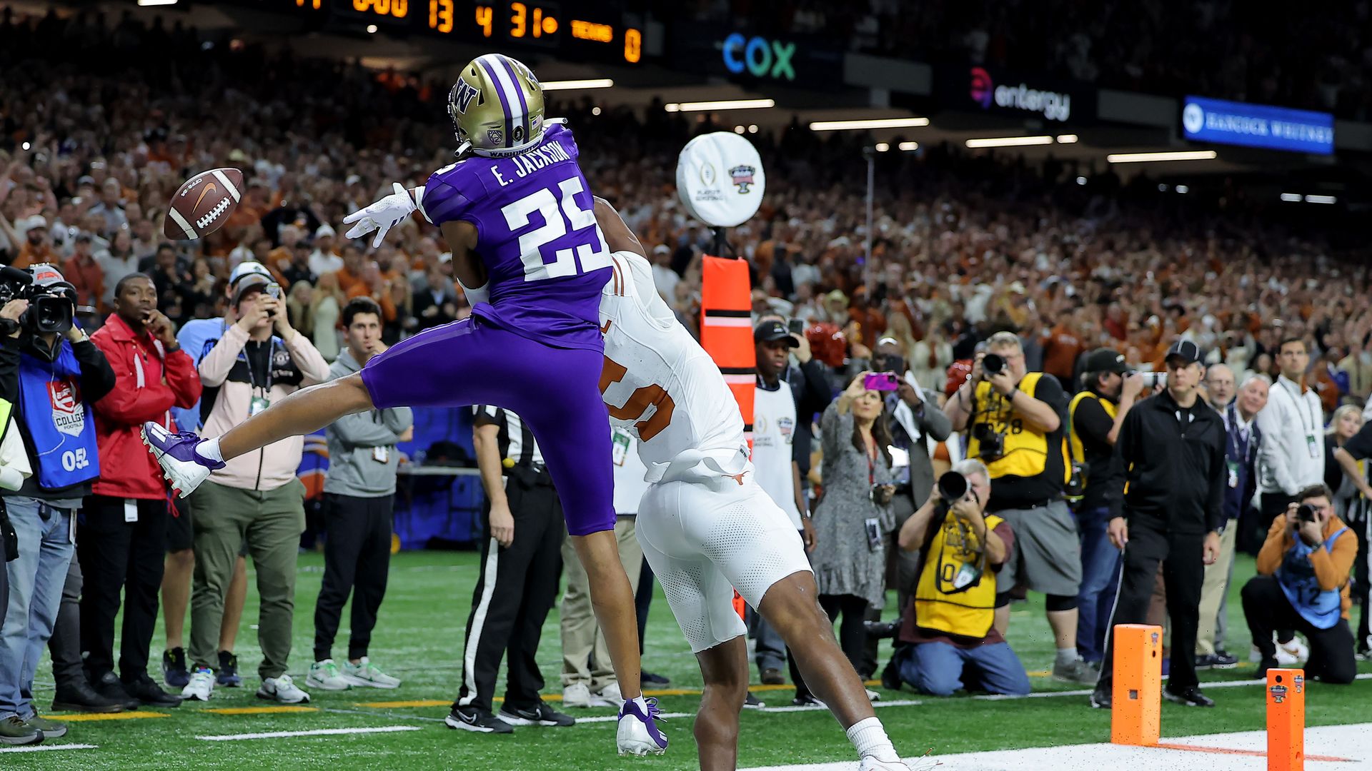 A Washington defender breaks up a pass to Texas receiver Adonai Mitchell on the final play of last night's College Football Playoff Semifinal in New Orleans. Photo: Jonathan Bachman/Getty Images