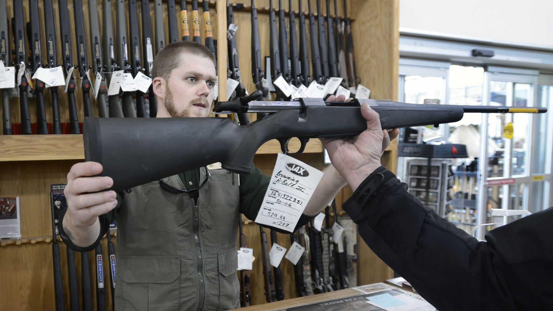 Employee Gabe Boylan, of Boulder, hands a rifle to a customer at Jax Mercantile in Lafayette in 2013. Photo: Jeremy Papasso/Boulder Daily Camera via Getty Images