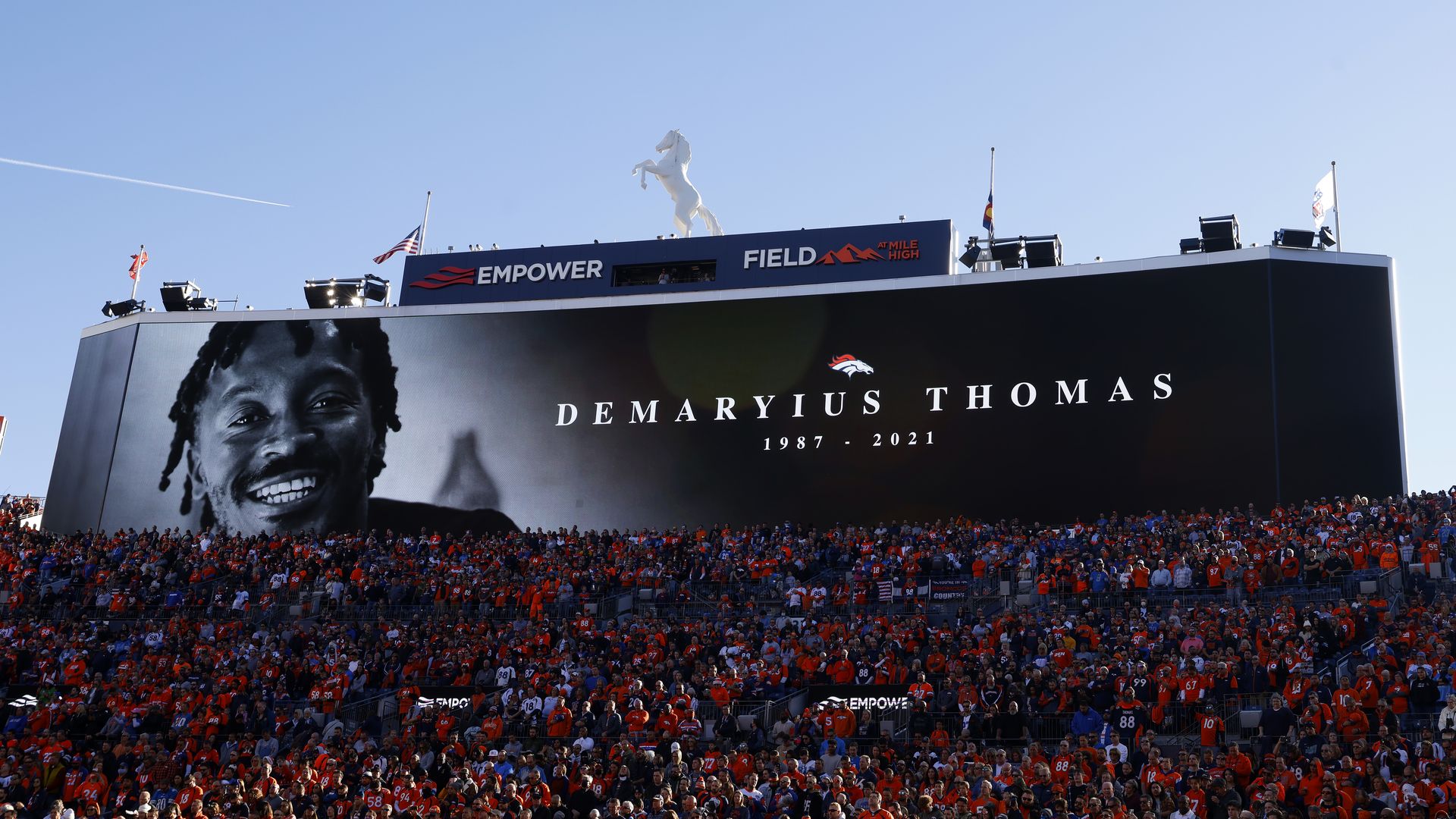 An image of the late former Denver Broncos player Demaryius Thomas is displayed on the big screen before Sunday’s game at Empower Field at Mile High. Photo: Justin Edmonds/Getty Images