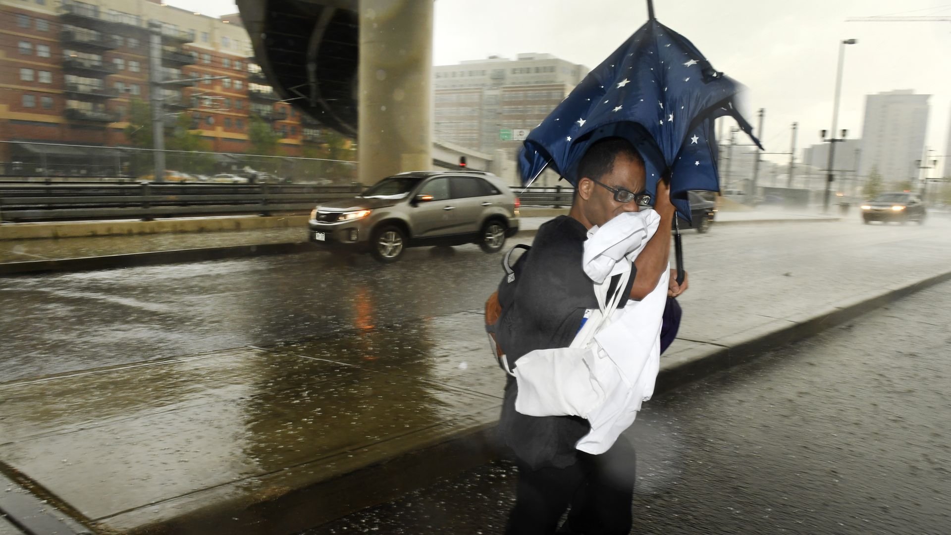 A man in Denver tries to keep his umbrella in his hands as strong wind blows during a storm in 2017. Photo: Helen H. Richardson/The Denver Post via Getty Images